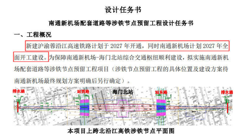 1月5日,南通市公共资源交易平台发布《南通新机场配套道路等涉铁节点预留工程项目方案及初步设计项目招标公告》和《海门北站综合交通枢纽项目招标公告》。根据设计任务书明确,南通新机场计划于2027年全面开工建设,与此同时,沪渝蓉沿江高铁也计划在2027年开通运行。