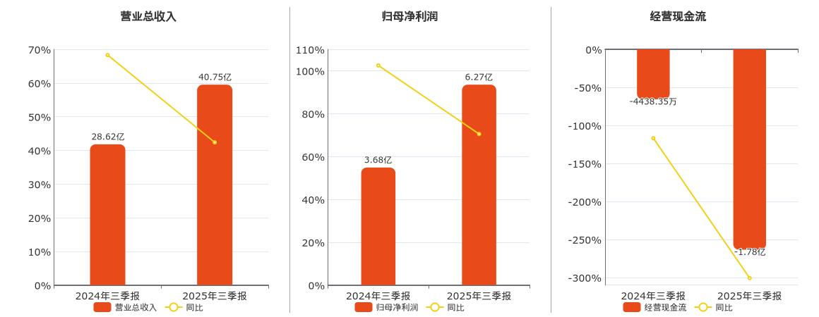 公司营业总收入为40.75亿元。归母净利润为6.27亿元。经营活动现金净流入为-1.78亿元,较去年同报告期经营活动现金净流入减少1.34亿元。
